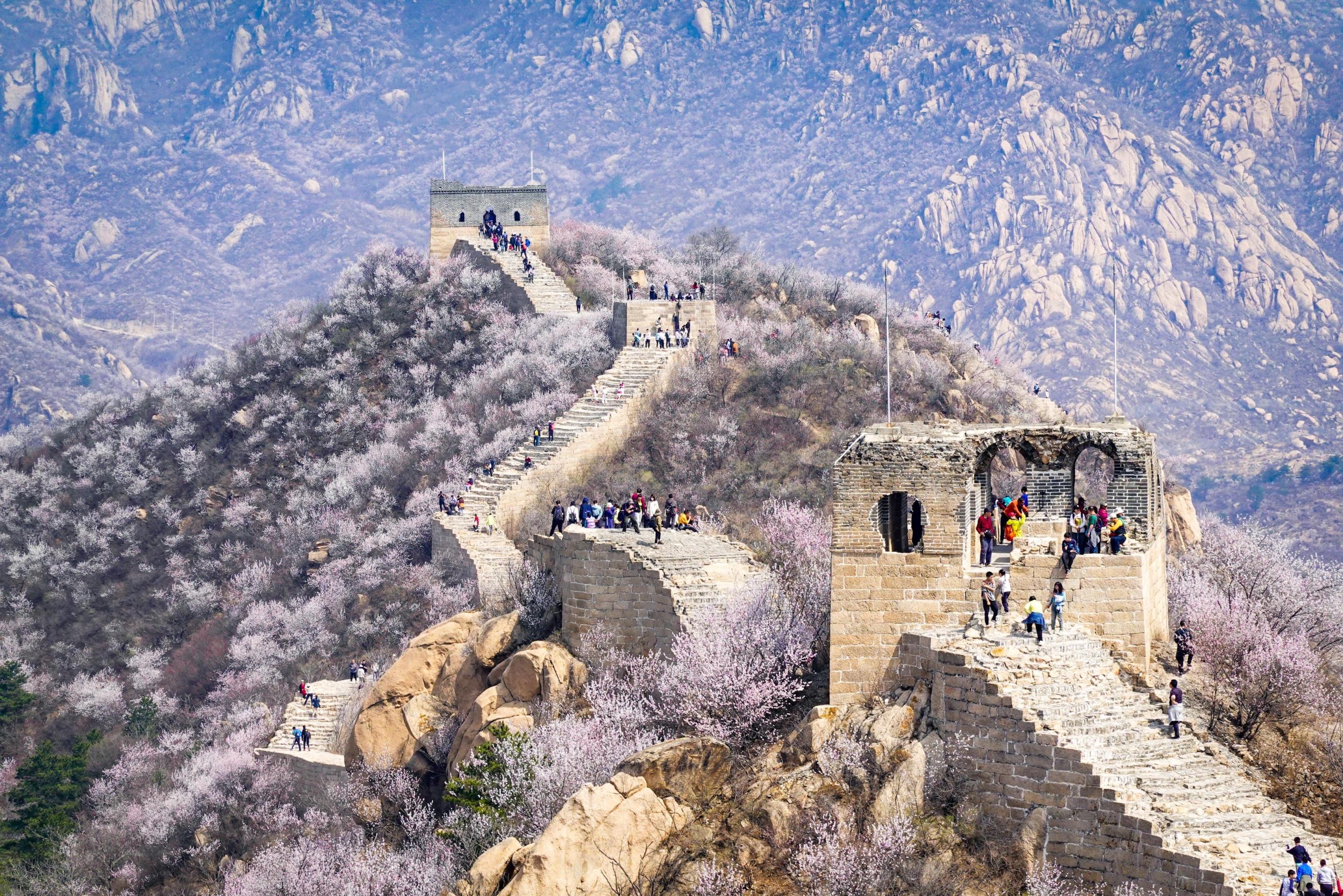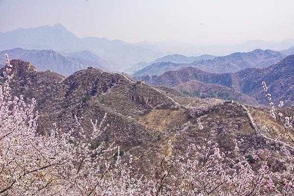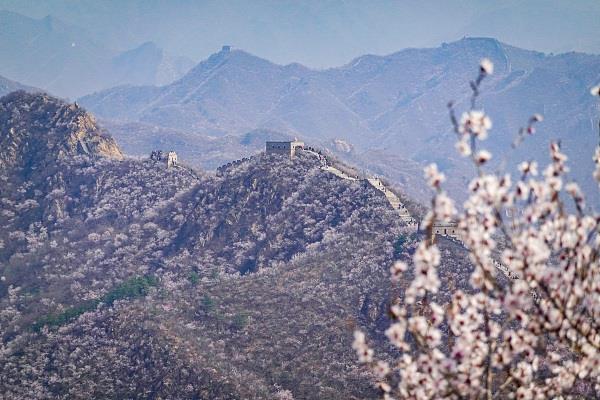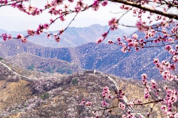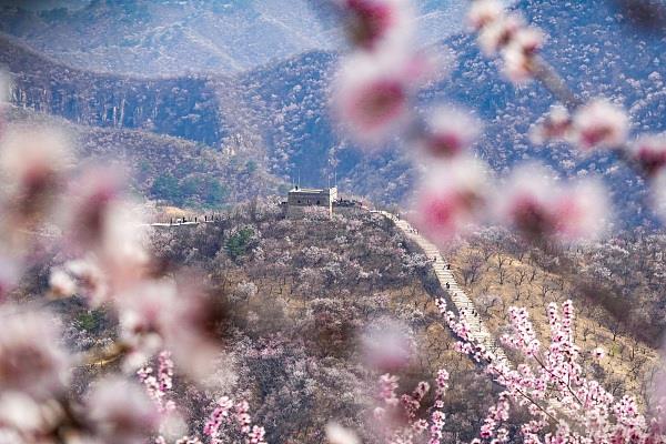 2024年4月5日,北京延庆大庄科,山桃、山杏花朵如云,陈旧的长城与春花相衬托,悦目壮丽。