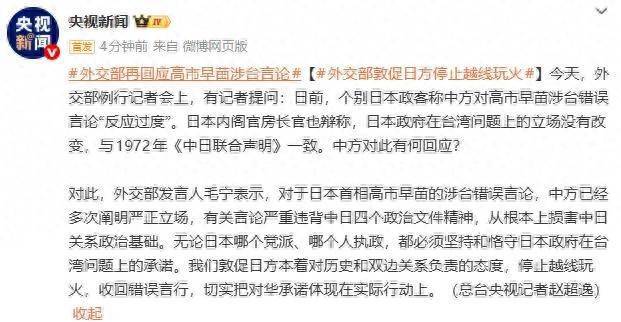 据央视新闻微博音问,今天,酬酢部例行记者会上,有记者发问:日前,个别日本政客称中方对高市早苗涉台诞谎言论“反映过度”。日本内阁官房主座也辩称,日本政府在台湾问题上的态度莫得编削,与1972年《中日归拢声明》一致。中方对此有何回话?